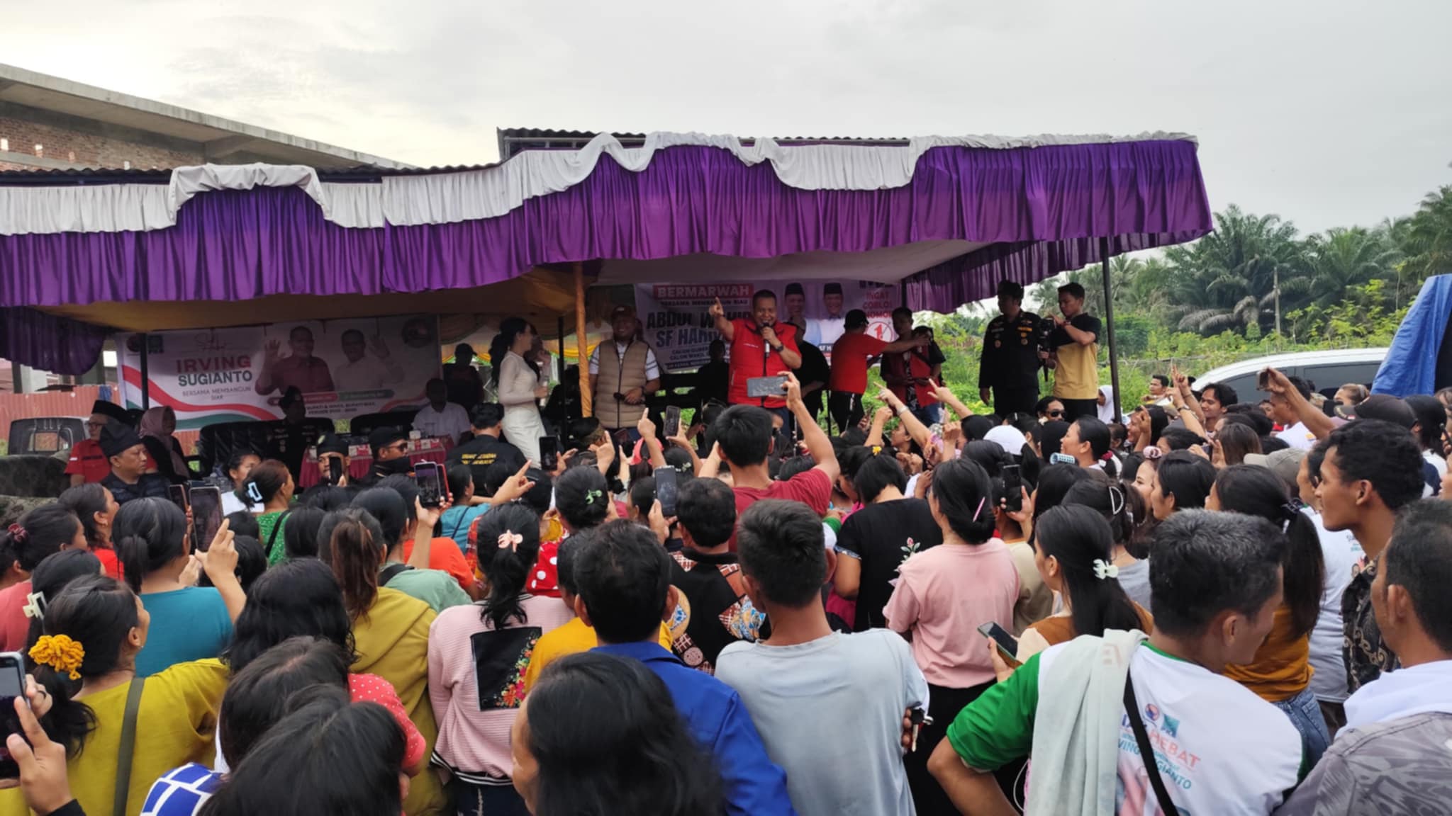 Ratusan orang menghadiri kampanye dialogis Calon Bupati (Cabup) nomor urut 1, Irving Kahar Arifin di Km 5 Kelurahan Perawang, kecamatan.