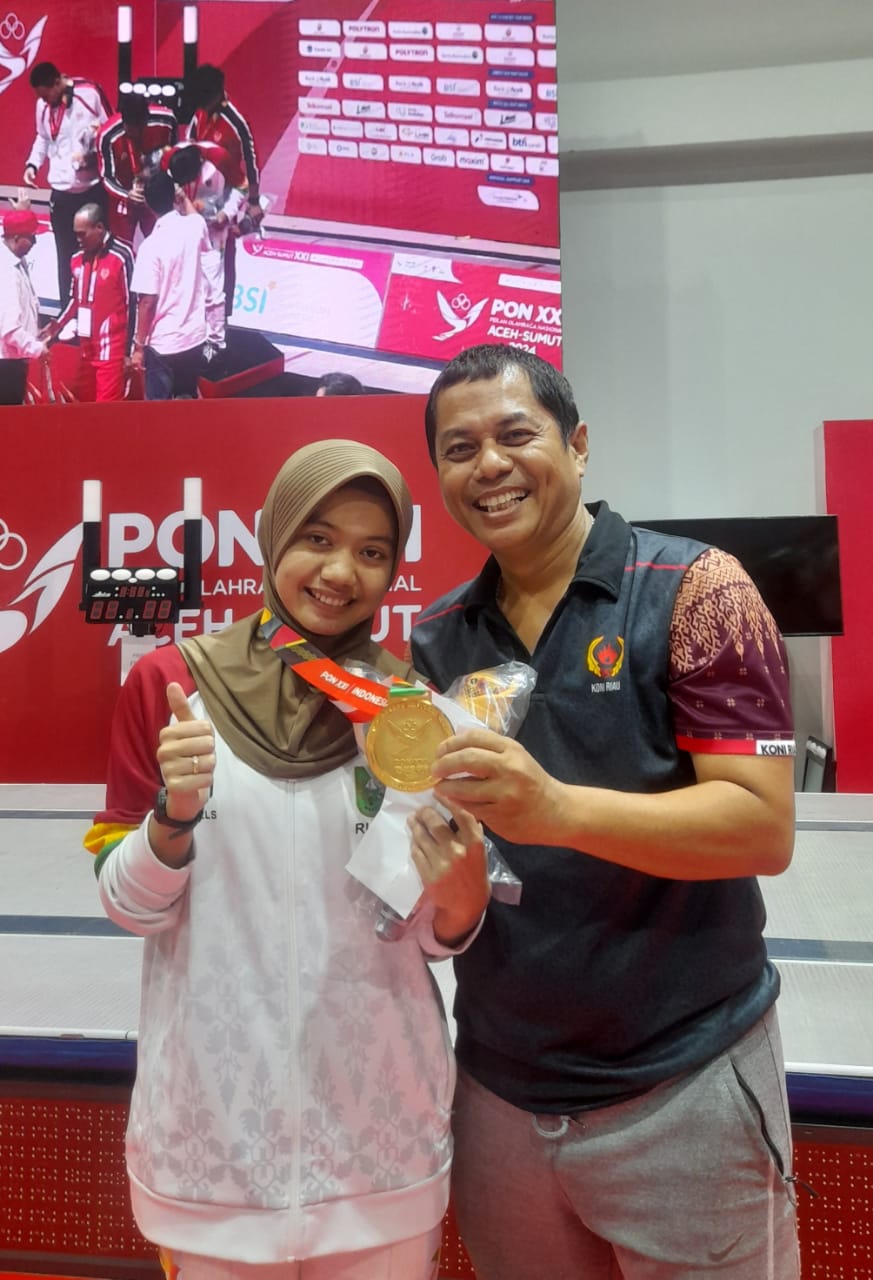 Wakil Bupati Siak Husni Merza selaku Ketua Umun Komite Olahraga Nasional Indonesia (KONI) Kabupaten Siak memberikan apresiasi pencapaian atlet anggar putri Ayu Pani.