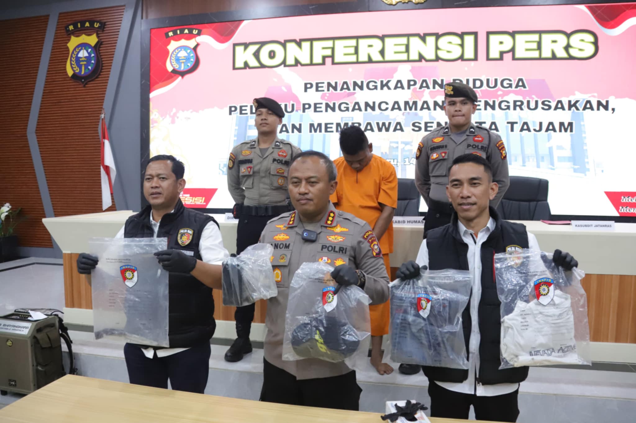 Kepolisian Daerah (Polda) Riau menggelar konferensi pers terkait pengungkapan kasus pengancaman yang sempat viral di media sosial. Konferensi pers tersebut dilaksanakan di Media Center Polda Riau pada Senin (14/4/2025),.