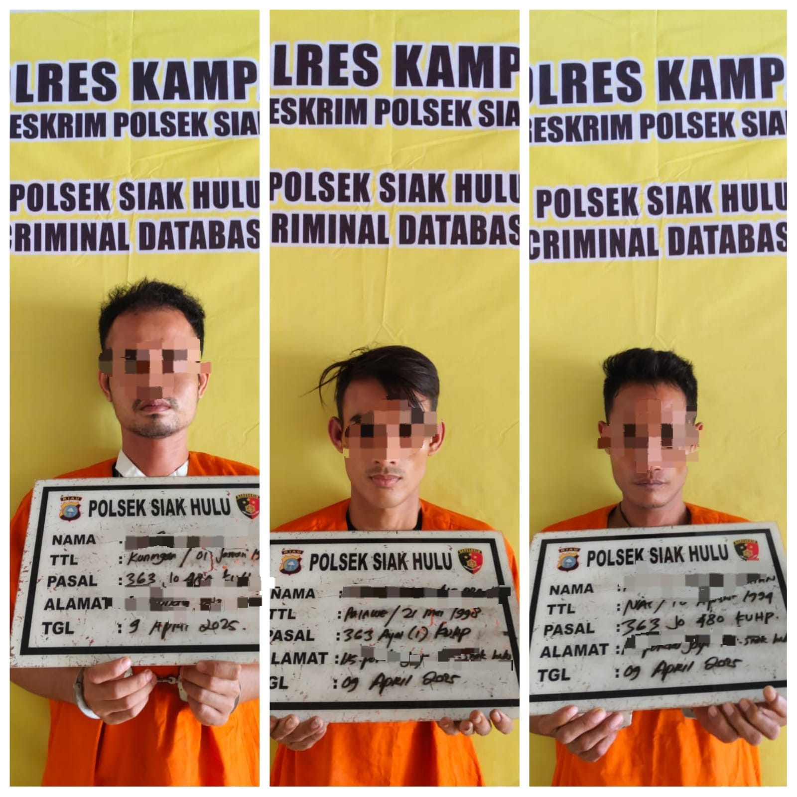 Satuan Reskrim Polsek Siak Hulu berhasil mengungkap kasus pencurian kendaraan bermotor (curanmor) yang terjadi di enam lokasi berbeda di wilayah hukum Polsek Siak Hulu. Tiga orang pelaku, yakni FS (27), TG (31), dan NG (31), berhasil diamankan dalam.