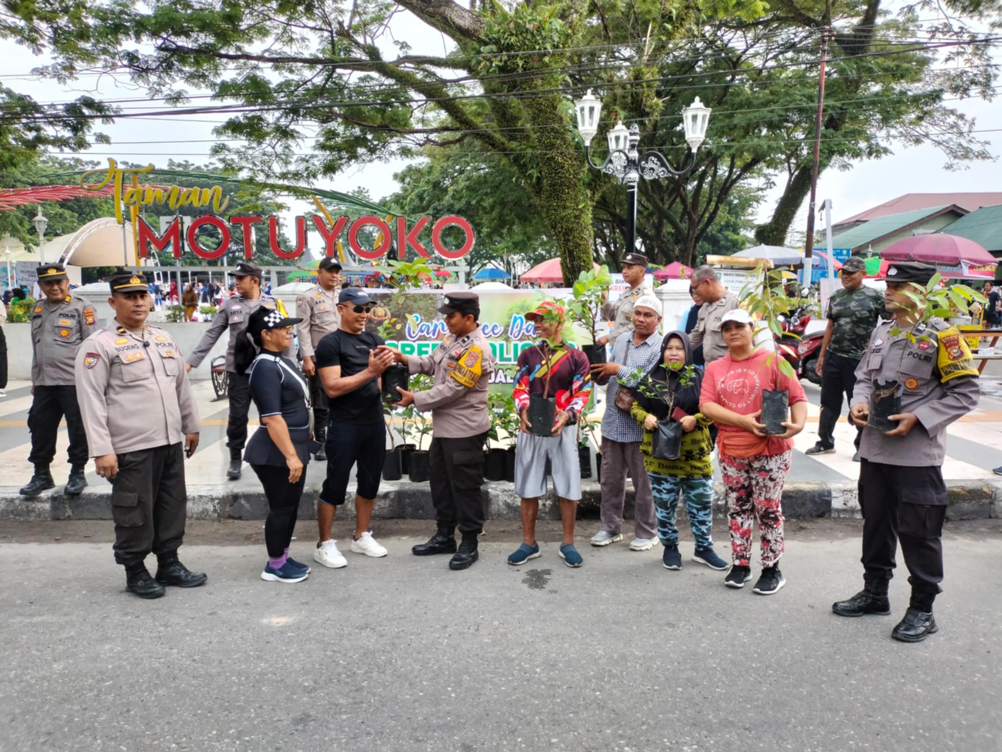 Dalam rangka mendukung program Green Policing Kapolda Riau, jajaran Polsek Tualang melalui Unit Binmas membagikan bibit pohon kepada masyarakat saat kegiatan Car Free Day (CFD) di Taman Motuyoko, Minggu (28/9/2025).