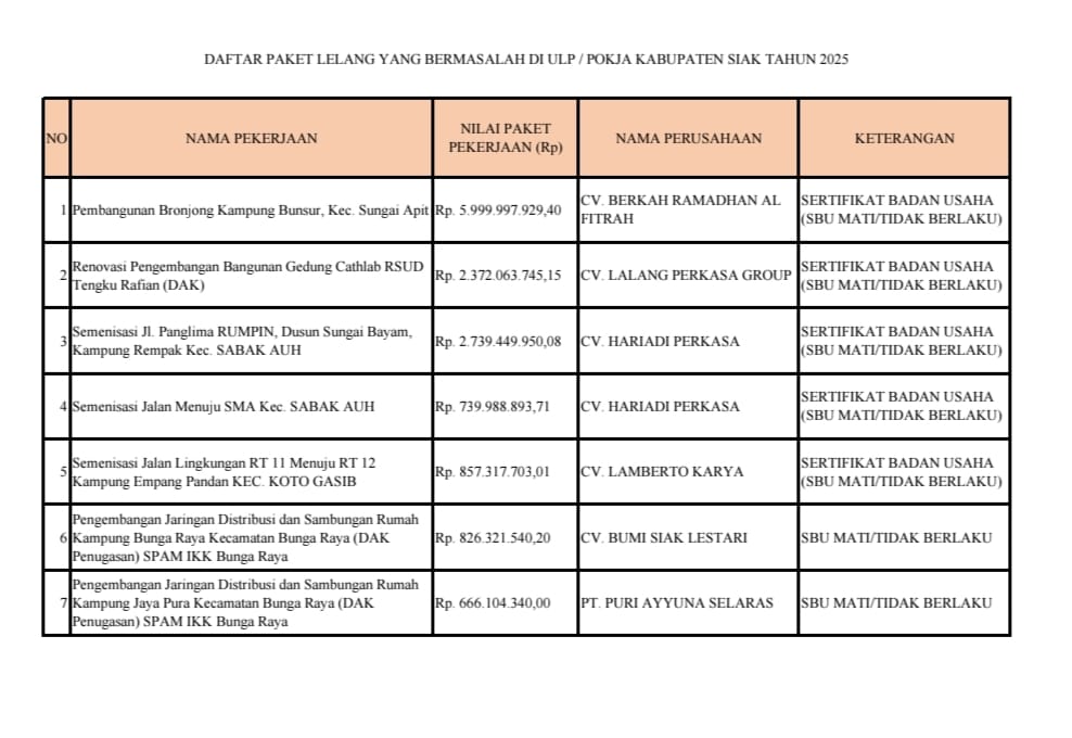 Kejaksaan Negeri (Kejari) Siak memanggil sejumlah pegawai Unit Layanan Pengadaan (ULP) barang dan jasa Kabupaten Siak, Riau, terkait dugaan penyimpangan proyek tahun anggaran 2025. Setidaknya lima orang pegawai ULP sudah diperiksa untuk dimintai.