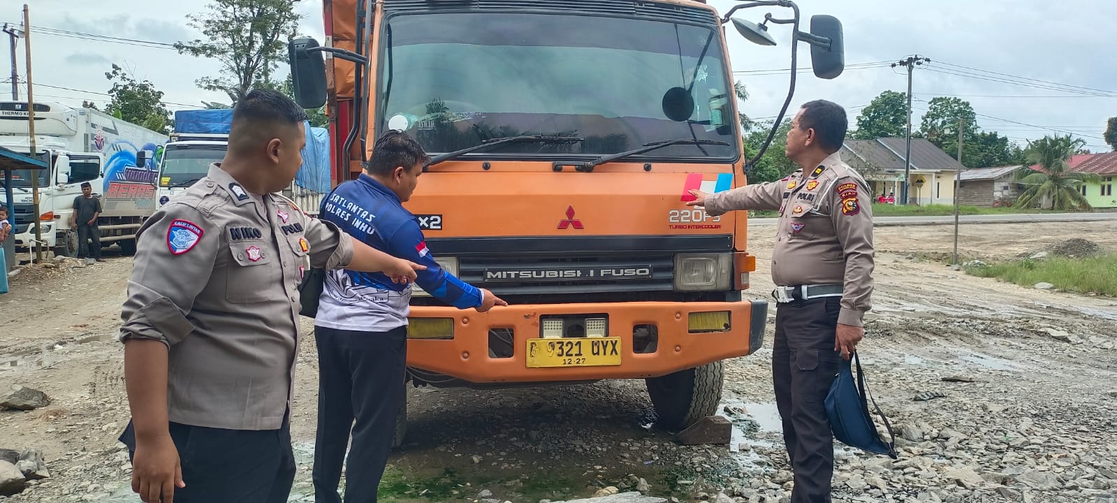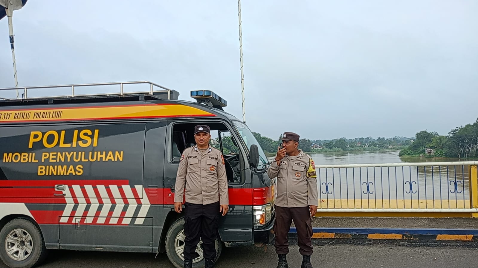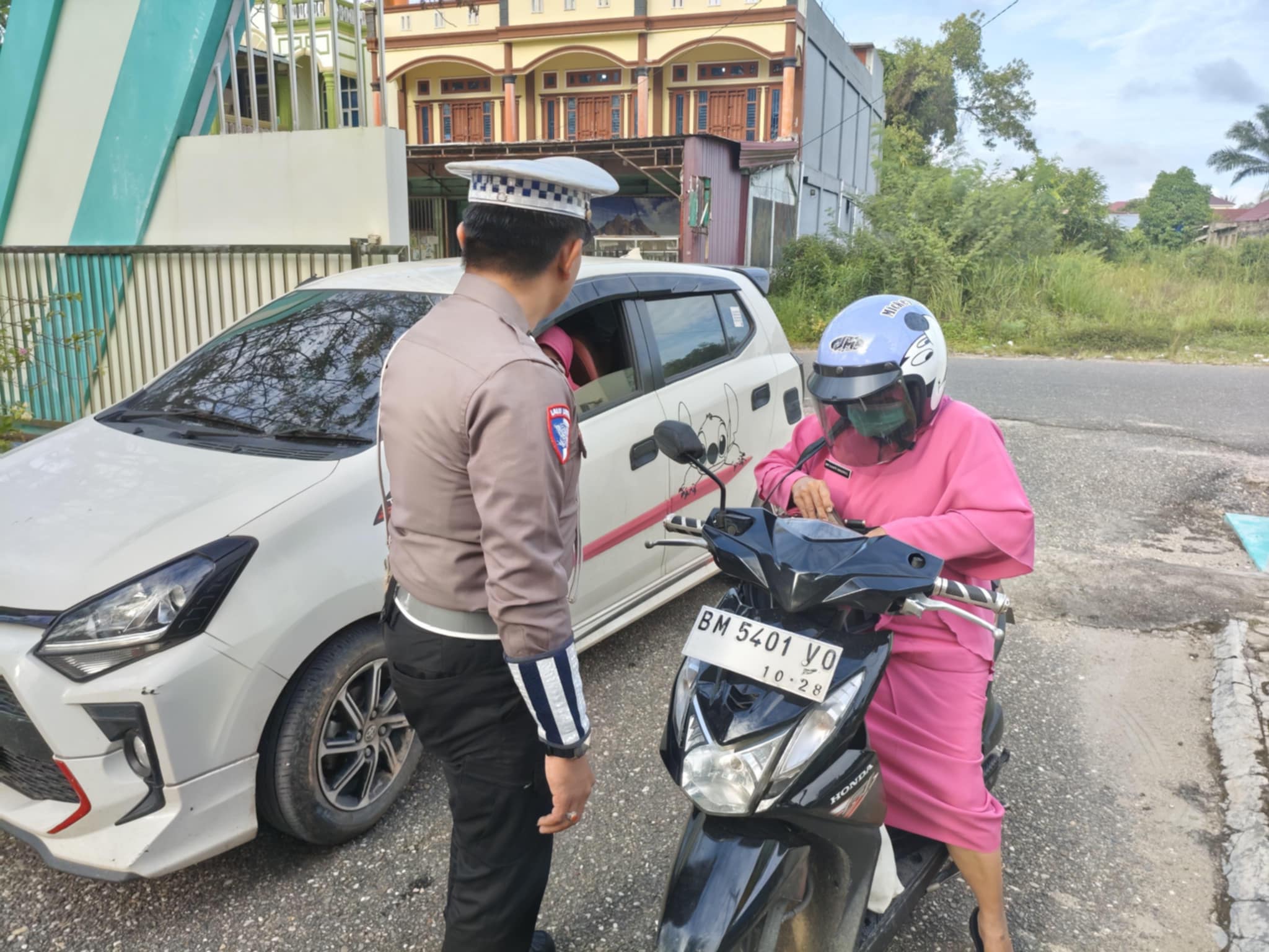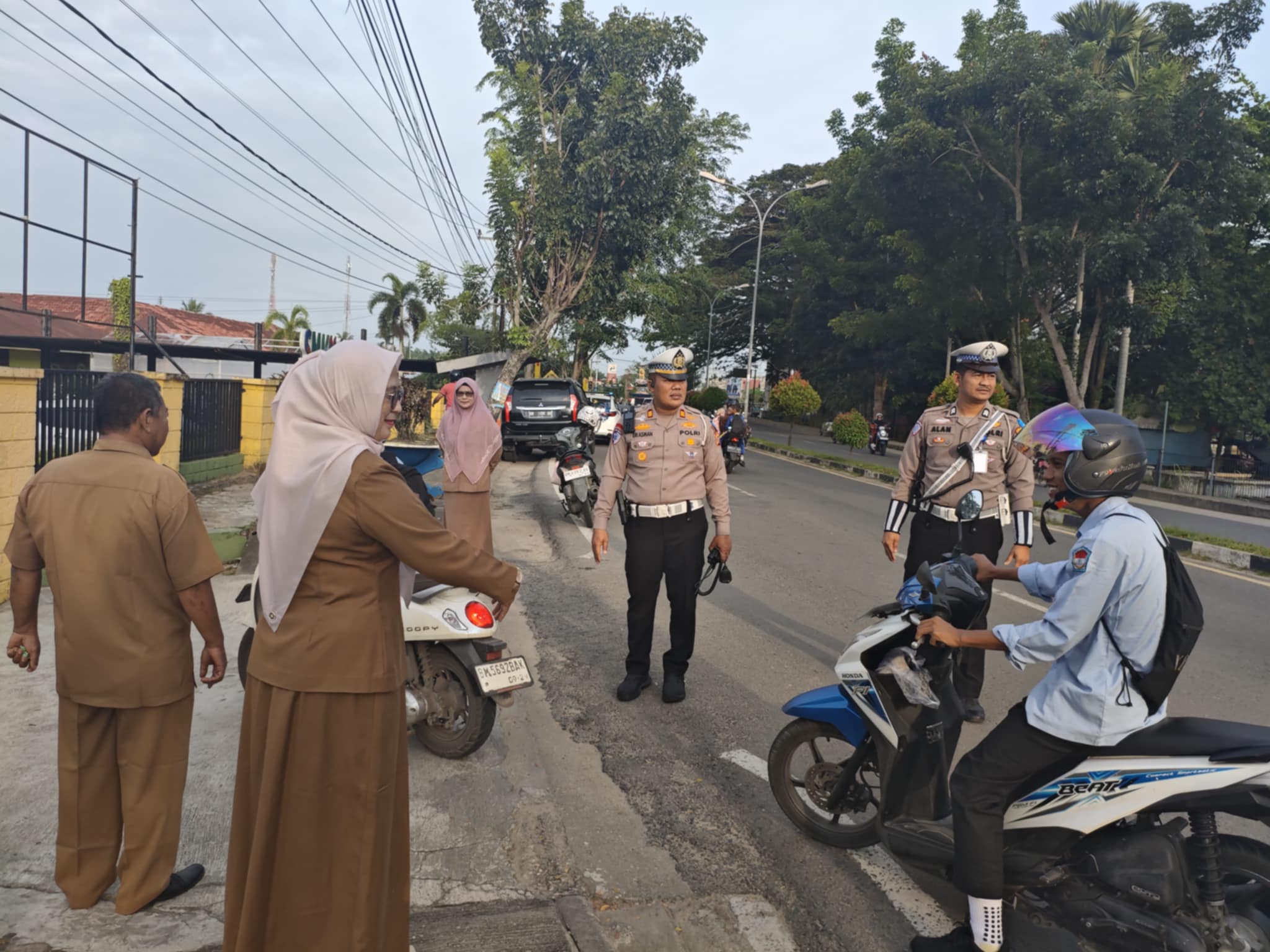 Hari kedua pelaksanaan Operasi Keselamatan Lancang Kuning (LK) 2025, Satuan Lalu Lintas (Satlantas) Polres Indragiri Hulu (Inhu) menggelar kegiatan sosialisasi keselamatan lalu lintas di depan gerbang SMKN I Rengat, Selasa.