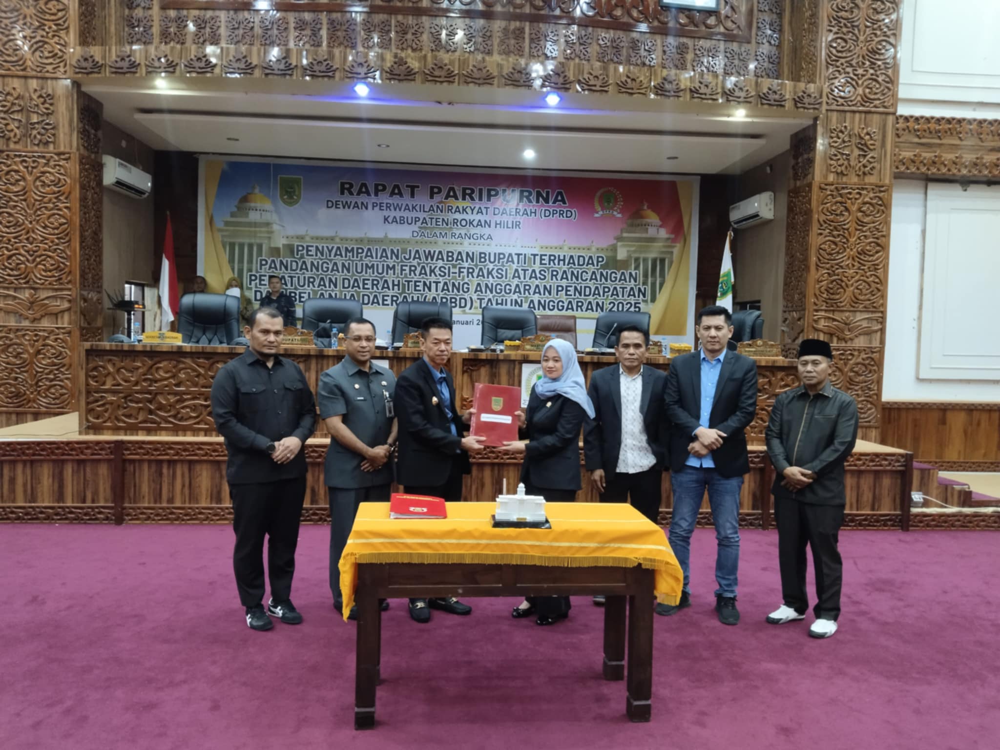Bupati Rokan Hilir Afrizal Sintong sampaikan jawaban pemerintah atas pandangan umum fraksi-fraksi terhadap Rancangan peraturan daerah (Ranperda ) Anggaran Pendapatan Belanja Daerah (APBD) tahun 2025 melalui.