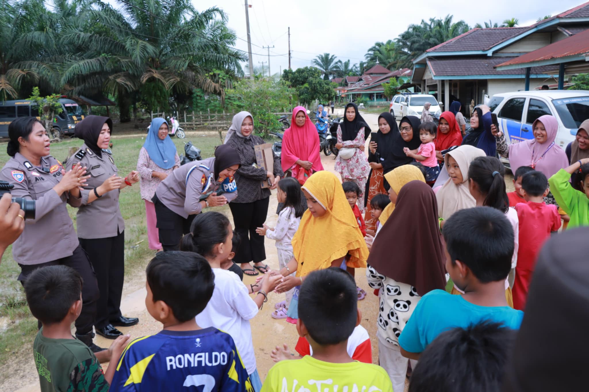 Tim Trauma Healing dari Bag Psikologi Biro SDM Polda Riau memberikan dukungan psikologi kepada anak-anak yang terdampak banjir di Desa Sahilan.