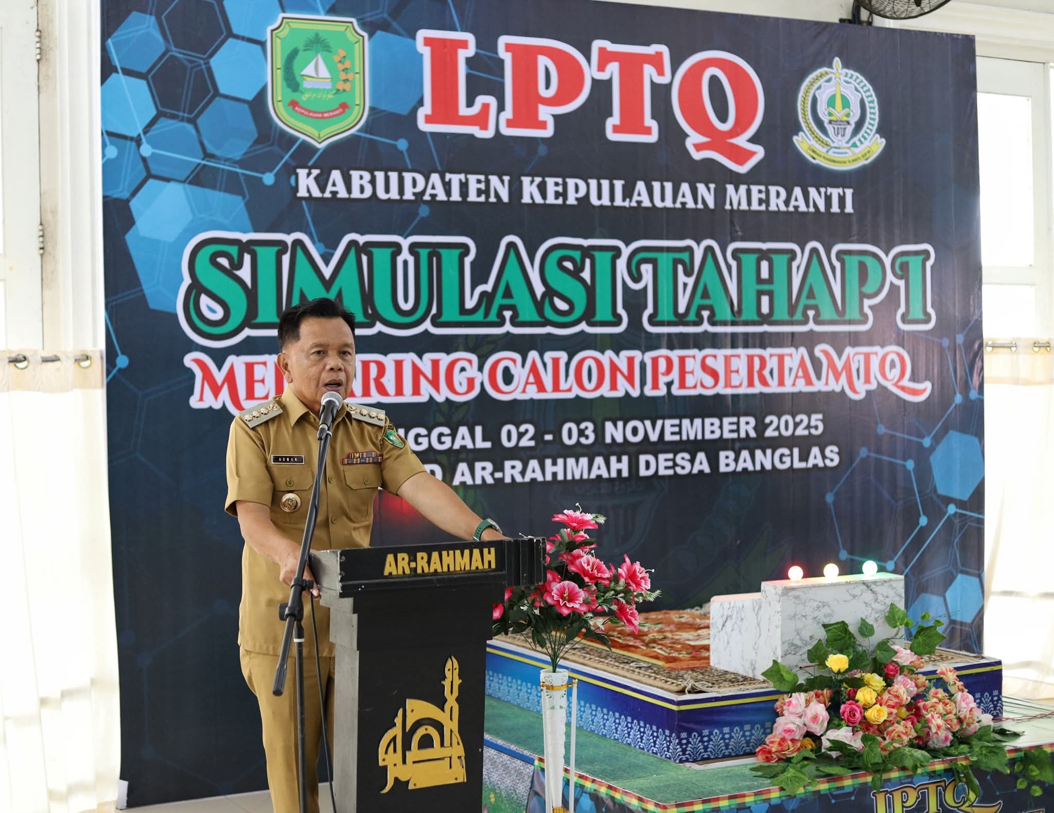 Bupati Kepulauan Meranti, AKBP (Purn) H. Asmar, memberikan apresiasi terhadap pelaksanaan Simulasi Tahap I Penjaringan Calon Peserta Musabaqah Tilawatil Qur’an (MTQ) Riau 2026 yang digelar di Masjid Arrahmah, Desa Banglas, Senin,.