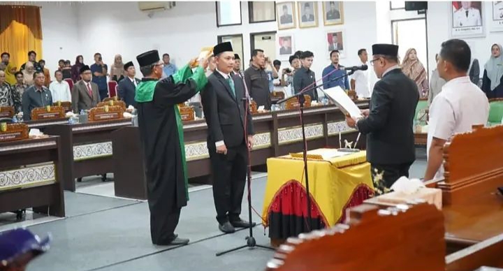 Aditya Pramana resmi mengucapkan sumpah dan janji sebagai anggota DPRD Kabupaten Kuantan Singingi (Kuansing) menggantikan Aldiko Putra dalam Rapat Paripurna Istimewa yang digelar di Gedung DPRD Kuansing, Rabu (30/4/2025).